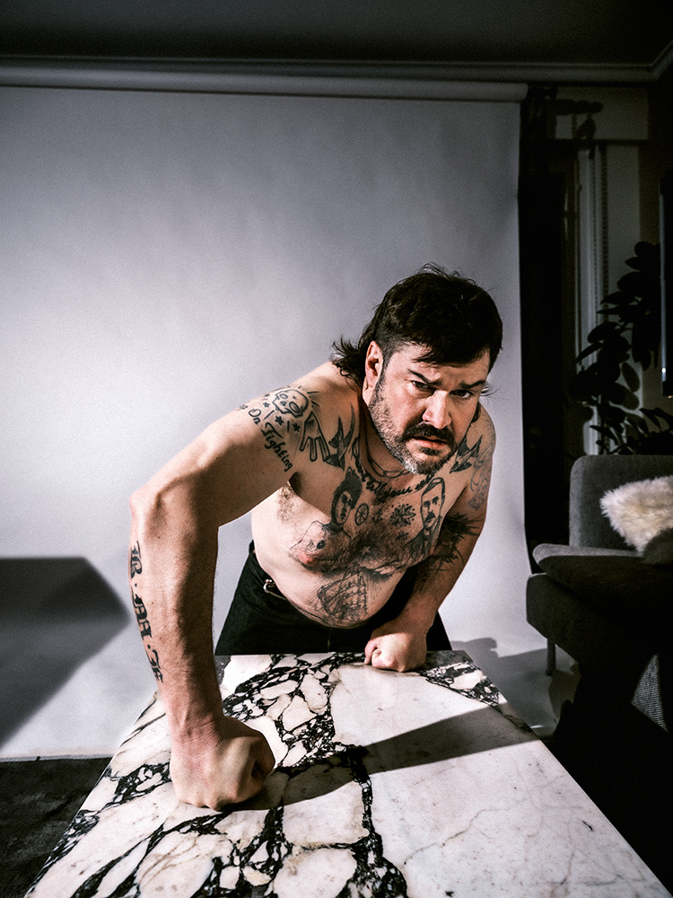 A man with tattoos leans heavily on a fractured marble table, staring with defiance – Baptiste Janin, 2023.
